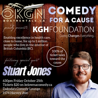 OKGN Boat Rentals presents Comedy for a Cause for the KGH Foundation on Friday, October 25th at 6:30 PM at Dakoda’s Comedy Lounge. Join us for a night of top-tier comedy featuring several of Kelowna Comedy’s best performers, with a special headlining performance by the hilarious Stuart Jones. Known for his sharp wit, self-deprecating humor, and nerdy charm, Stuart takes life’s everyday moments and turns them into laugh-out-loud absurdities. Having released his debut album ‘By the Slice’ in 2020 and his 2024 comedy special ‘Homebody,’ Stuart is set to deliver a show you won’t want to miss. Thanks to the generous sponsorship of OKGN Boat Rentals, 100% of ticket sales will go directly to the KGH Foundation. Don’t miss this chance to laugh for a great cause!