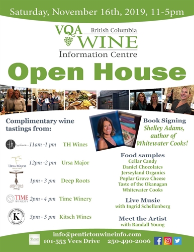It’s our annual Open House and we are super-excited about this year’s event! Shelley Adams from Whitewater Cooks will be here signing books, artist Randall Young will be here, live music with harpist Ingrid Schellenberg, and food samples from Cellar Candy, Daniel’s Chocolates, Jerseyland Organics, Poplar Grove Cheese, Taste of the Okanagan, and Whitewater Cooks. Of course there will be wines to taste too! Our tasting bar will feature wines from TH Wines, Ursa Major, Deep Roots, Time Winery, and Kitsch Wines. Lots of things to see, do, and taste from 11am to 5pm!