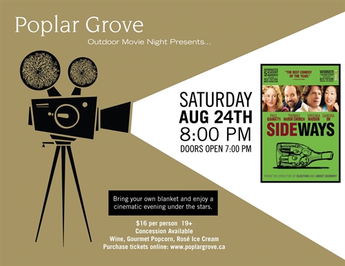 <p>Our last movie night was cancelled due to some thunder! We thought we’d try again.August 24th, doors open at 7:00pm, movie starts at 8:00pm$16 per person 19+Concession AvailableWine, Gourmet Popcorn, Rosé Ice CreamSeating is first come, first serve. Doors open for seating at 7 pm.*No outside food or drink permittedMovie:Sideways (2004) Rated R – Two men reaching middle age with not much to show but disappointment embark on a week-long road trip through California’s wine country, just as one is about to take a trip down the aisle.https://www.imdb.com/title/tt0375063/</p>