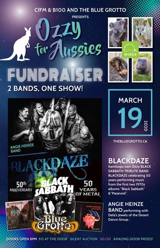 The cutest fire relief fundraiser for our Australian friends and animals benefiting “WIRES” animal relief organization. This is too cute to not throw money at. Some of the saddist S@#* I’ve ever heard. So let’s have a ripper for Australia March 19th The Blue Grotto Nightclub with The Angie Heinze Band jewels_of_the_desert Dela Coutts Dance group performing with Angie. Blackdaze Ozzy Sabbath Tribute band will be celebrating 50 years performing music from the first two 1970s albums “Black Sabbath” and “Paranoid”. Russel spends two hours combing out his tassles so let’s not let them down. This will be a rare and special night of killer rock and roll not to miss. $15 at the door, 50/50 draws, door prizes. Whats a world without Roos and Joeys? Come on!