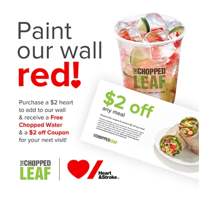 Throughout the month of February, The Chopped Leaf’s 2 Kamloops restaurants are raising money for the local Heart & Stroke Foundation. It’s a win-win for customers who buy a red heart for $2, and receive a free Chopped Water plus a $2 off coupon for their next visit.