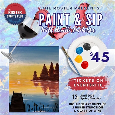 <p>April’s paint and sip event, hosted by the talented artist, Annelle Bachelder, offers an early spring sun setting over a serene lake. Painters will experiment with colour theory, blending and silhouettes to create their own master piece. Whether you’re a beginner or a seasoned painting enthusiast, this class promises an enjoyable and rewarding experience for all skill levels. <br />Plus, to get your creative juices flowing, we’re including a 6oz glass of wine (or other beverage option) to sip on as you paint. <br />Annelle is a lifelong lover of art, having studied in both fiber and traditional arts at Brigham Young University Idaho. Whether it’s knitting in the winter or plein air painting with acrylic and watercolor in the warmer seasons, Annelle’s passion for art shines through in everything she does. She’s instructed many classes and greatly enjoys helping others with the foundations of art so they can continue to foster their love and creativity for the medium. <br />Seating is limited, so book your spot soon for a night of fun and creativity at The Roster Sports Club Bar & Grill! <br />Doors open at 4:30 p.m. Instruction starts at 5:00 p.m.</p>