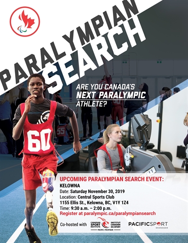 Paralympian Search is a FREE one-day athlete identification event being held at Central Sports Club and is designed to test participant aptitudes to excel in various Paralympic sports, and maybe one day represent Canada at the Paralympic Games.The event also welcomes current or former athletes from all levels aiming to transfer into a new Paralympic sport or discover a new sport that can complement their main discipline.Each participant goes through a set of basic physical challenges conducted by national team coaches and other experts. There is a chance to try out a few sport demonstrations. During this event, you will also get to meet current Paralympic athletes and alumni from various sports who will be sharing their experience and answering your questions.Participants of ages 14 and up who have a physical disability or visual impairment can come to a Paralympian Search. You may or may not have previous sport experience, but if you are interested in discovering which Paralympic sports you are eligible for and have the greatest potential, you can come find out more at a Paralympian Search.If you’re an athlete that wishes to register, please do so at https://paralympic.ca/kelownaAlso, if you’re an athlete, coach, parent, friend, and want to come to cheer and support, please do!