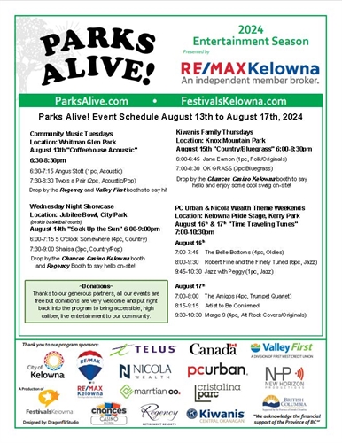 <p>Established in 1997, Parks Alive! is an award winning, multi-venue, 9-week concert series that energizes Kelowna’s parks and public spaces through live cultural performances each summer. <br />Welcoming over 24,000 guests annually, our FREE shows can be enjoyed by all ages and are driven by the goal of creating experiences our residents and visitors to our community will love! </p>