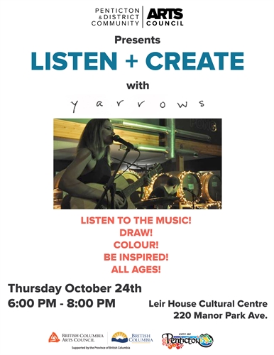 The Penticton and District Community Arts Council presents our Listen + Create series.Listen to live music from local band Yarrows, while you draw, colour & be inspired!This event is all ages and by donation! https://yarrows.band/https://pentictonartscouncil.com