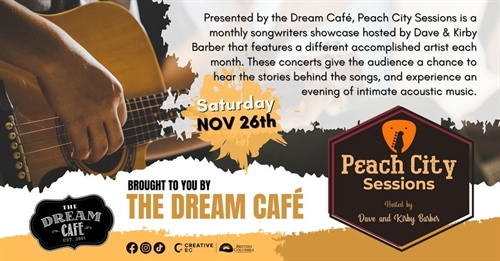 <p>Presented by the Dream Café, Peach City Sessions is a monthly songwriters showcase hosted by Dave & Kirby Barber that features a different accomplished artist each month. These concerts give the audience a chance to hear the stories behind the songs, and experience an evening of intimate acoustic music. (Doors open at 6pm, kitchen is open from 6pm-9pm, and the show begins at 8pm.)<br />Hosted by seasoned industry professionals, Dave & Kirby Barber are award winning musicians who most recently moved to Penticton after living in Nashville for the past several years. They have toured around the world backing up dozens of artists from Canada and the US. They currently perform their own music as well as continue to tour with artists such as Shari Ulrich, Barney Bentall, Aaron Pritchett, Chad Brownlee, Heidi Newfield and Brittney Spencer. www.gbroots.com<br />David & Kirby Barber on YouTube:<br />https://youtu.be/bPKB6KX2INo<br />November 26th features Canadian Country Artist, Chad Brownlee. A multi talented artist, his passions for music, acting, sport and philanthropy run deep. Once a Vancouver Canucks draft pick, and now a critically acclaimed country music star with over a decade on the road, Brownlee is no stranger to the music scene. His raw musical talent, and compassionate storytelling exploring the adventures of life, inspire his signature pop, country and rock sound. www.chadbrownlee.com<br />Chad Brownlee on YouTube:<br />https://youtu.be/ZT19ijVRUT0<br />Opening Artist will be Joshua Smith. Joshua Smith is a Maritime songwriter, living in the Okanagan. You don’t have to work hard to enjoy Joshua Smith’s music. His songs present themselves to you with an open heart; They are clear-eyed, empathetic and penetrating, with an absolute lack of pretension. Without pandering, they seek to satisfy both your ear and your understanding. www.joshuasmith.bandcamp.com<br />Joshua Smith on YouTube:<br />https://youtu.be/OjKAfoVNEg8<br />For more information visit us online at www.thedreamcafe.ca</p>