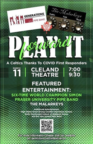 <p>You’re invited to a FREE concert! Join the Penticton Scottish Festival for a Celtic thank you to our COVID-19 first responders on March 11, 2023 from 7:00pm – 9:30pm at the Cleland Theatre in Penticton. Let’s celebrate our amazing honoured guests with a Celtic flair.?? Meet one of our Entertainment Headliners: Six-Time World Champion Simon Fraser University Pipe Band!The six-time World Champion Simon Fraser University Pipe Band will take to the stage at the Cleland Theatre on March 11. This is a rare opportunity to experience an evening of exhilarating music with the world-renowned pipe band that has filled venues such as Carnegie Hall, the Lincoln Center, and the Sydney Opera House.The past 41 years has seen the band push the boundaries of the pipe band world and bring it to new heights in both the competition arena and the concert stage. Most recently, the SFU Pipe Band captured ‘the sash’ in August 2022 – the prize at the World Championships awarded to the best drum corps. The band is one of only four from outside of the United Kingdom to have captured the prestigious title of World Champions. Having done so a staggering six times makes SFU the most successful pipe band outside of Britain.But SFU is much more than a competition pipe band – they have performed concerts around the world and have produced twelve albums to date. The band has always delivered on its promise to blow away audiences with their combination of technical skill and unmatched creativity in their presentation of Scotland’s traditional music.??Community ticket requestsVisit our website to register for FREE tickets to this amazing concert. Guests will be notified via email when they are available for pick-up. These requests will be distributed on a first come/first served basis. Register for tickets here now: https://www.pentictonscottishfestival.ca/play-it-forwardThank you to Heritage Canada and the Government of Canada for their financial support. Because of their funding, this event is FREE to our community.?? Celtic Entertainment LineupThe MalarkeysHigh Water Drum GroupCastilla Irish Dance SchoolEmily MacDonald School of Highland DanceVale United Pipe BandWe can’t wait to see you there!</p>