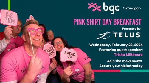 <p>Join BGC Okanagan’s celebration of kindness and lifting each other up at the annual TELUS Pink Shirt Day Breakfast 2024.Pink Shirt Day has always been a meaningful day for BGC Okanagan, as it reflects the core values of belonging, respect, encouragement and support, working together and speaking out.We are excited to have International Speaker, Trisha Miltimore, share personal stories that have taught her how to live with less stress and more enjoyment. Using the tools of Kindness, Community and Gratitude we can engineer an elevated life experience that is more fun, fulfilling and impactful. #yeswecan Trisha Miltimore is passionate about empowering teams, leaders and HUMANS to engineer their own DEEPLY SATISFYING LIFE EXPERIENCE.</p>