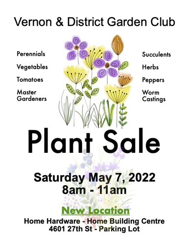 <p>Perennials, tomatoes, vegetables, succulents, and herbs grown by Garden Club Members will be for sale at this annual fundraiser. Master Gardeners will be in attendance to answer your gardening questions. Come check it out on Saturday May 7, 8am-11am at Home Hardware-Home Building Centre parking lot – 4601 27th Street, Vernon.</p>