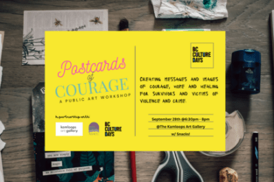 Lindsey Tyne Johnson presents Postcards of Courage, a unique experience aimed atsupporting survivors and victims of violence and crime. This free-to-attend, artisticworkshop will encourage a creative journey that will allow you to express yourself,connect with others, and make a positive impact. Engage in the art of postcard-making,crafting messages of healing and hope for survivors. Each postcard symbolizes support,reminding survivors that they are not alone and that their stories matter. The postcardswill be given to survivors in times of need by local organizations that support survivorsand their needs.The Kamloops Sexual Assault Counselling Centre will be present,providing vital resources and educational materials. Moreover, a therapist/counsellor willbe on-site to provide any emotional support.