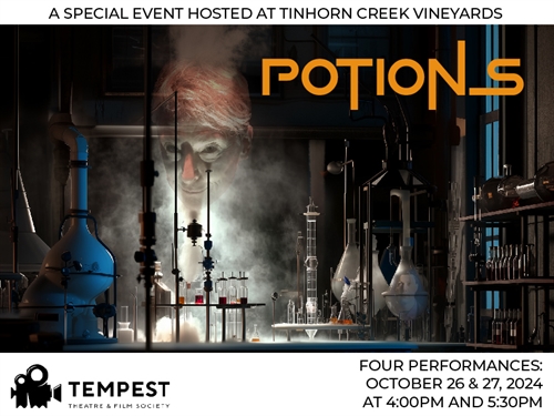 <p>Potions is an original immersive theatrical presentation paired with wine. The audience is invited into Tinhorn Creek’s cellar to taste wine and experience performances exploring our human passions– in all their delightful, dark, and mysterious messiness. We will time travel to the year 2039 where all art and wine have been outlawed for 15 years. This unique and exciting tour will plunge you into a secret underground world of original art and delectable wines. For all human history, art and culture have been entwined, so together, we can renew our understanding and appreciation for both and have a lot of fun doing it! This is an experience created in partnership with Tinhorn Creek, Tempest Theatre, Cat’s Paw Productions and UBCO. You don’t want to miss it!This ticket includes a complementary wine tasting featuring a flight of 5 of Tinhorn Creek’s wines chosen specifically for this event, as well as an additional special pour selected by head winemaker Leandro Nosal.Please note: this event is being held at Tinhorn Creek Winery at 537 Tinhorn Creek Road, Oliver.October 26 & 272 performances per day at 4pm and 5:30pmTickets are $55 (plus taxes and fees)</p>