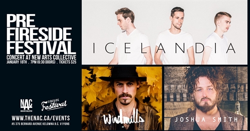 PLEASE NOTE: Joshua Smith will not be performing this concert due to a family emergency. We have invited Chloe Davidson to perform in his place, and she has graciously agreed to fill in! We are excited to welcome her to the stage! Saturday, January 18th7PM (Doors at 6:30 PM)Tickets $25Cash Bar // This event is 19+Join us for a pre-show to Fireside Festival!The night features some of Kelowna’s top talent: Joshua Smith, Windmills, and Icelandia!This event is a pre-cursor ramp-up to the main festival which will take place on the weekend of January 24th, 25th, and 26th in various locations.