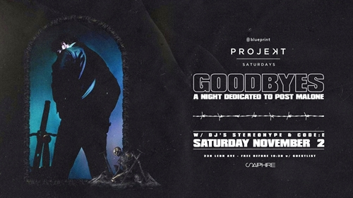 #ProjektSaturdays presentsGOODBYESA Night Dedicated to Post MaloneThis week featuring DJ’s:Stereohype & Code:EPresented by Blueprint Okanagan (19+ Only)Stay connected with Kelowna’s favorite Saturday Night using #ProjektSaturdays!Venue Notice:Sapphire abides by safety and security standards which include the use of proper footwear and having two pieces of identification available at all times. You will not be permitted inside the venue if you are wearing flip-flops or sandals and may be denied entry if unable to provide identification at request. Thank you!