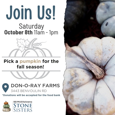 <p>Join us in celebration of our clients and the new season ahead!<br />Bring your family, & pick a pumpkin- we would love to see you!<br />3443 Benvoulin Road at Don-o-Ray Farms<br />*Donations will be accepted for the food bank</p>