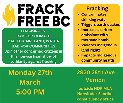 <p>Please join us for a joint public show of solidarity against fracking. Frack Free BC, Climate Action Now and other non-partisan organizations are throwing their support behind this important event. It will be held on Monday, March 27th outside MLA Harwinder Sandhu’s office, 2920 28th Ave, Vernon at 5:00 PM. Bring banners, posters or anything creative to highlight the importance of stopping fracking and climate destroying methane gas.</p>