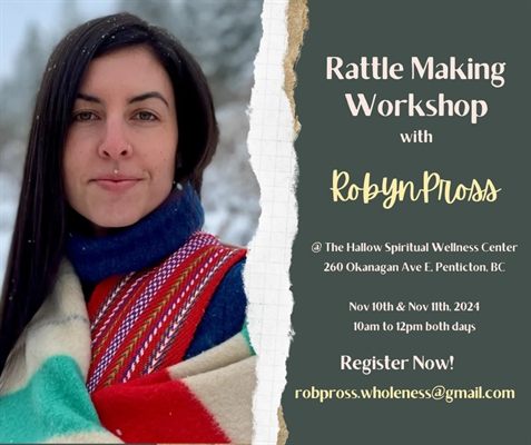 Join Robyn in this two-part workshop to create a new extension of your being!Together we will journey to your new round or oval rattle, birth, paint, integrate, and learn about this sacred tool. If you are worried about your creative abilities, don’t worry, Robyn is a multifaceted artist who will help you each step of the way!Day 1 – Sunday, Nov 10th 10 am to 12 pmDay 2 – Monday, Nov 11th 10 am to 12 pm (a moment of silence will be observed at 11 am)To reserve your spot please e-transfer your non-refundable $60 deposit to: robpross.wholeness@gmail.comThe remaining amount will be required on the first day of our workshop.?????? ?????? ?????????????????? ???????????? ????????/????????/?????????? ?????????? ???? 250-307-46372-day workshop to allow your rattle to dry. Then we decorate it!