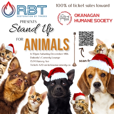 RBT Restoration by Trades presents the annual Stand Up for the Animals Christmas Comedy Fundraiser in support of the Okanagan Humane Society, happening Saturday, December 14th at Dakoda’s Comedy Lounge in Kelowna. Celebrate the holiday season with a night of laughter featuring Kelowna’s top comedians, all while supporting a great cause. 100% of ticket sales will go directly to rescuing and caring for animals in need. Don’t miss this festive tradition filled with holiday cheer, hilarious performances, and the chance to make a difference!