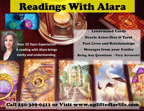 Readings with Mystic, Astrologer, Channel and Akashic Records specialist – Alara SeraitOffering 15 minute readings, 1/2 hour and 1 hour readings on location. Now also taking pre-bookings for Akashic Records Readings. Find out what’s in store for your year! Answering all questions! Enjoy a lifepath/combo reading or a quickie look-ahead or problem-solving reading. With over 25 years experience in the Mystical Arts, Alara uses her gifts of the “Clairs” along with amazingly accurate tools such as the Astro-Dice, Lenormand Oracle, or Tarot. Specializing in Relationships and Past-Lives. Alara is an experienced psychic consultant, who loves helping her clients receive and understand spiritual messages from their higher selves. As a channel she will also receive messages from your guides, angels, and often the Ascended Masters. She has a special passion for tuning into relationships and past-life phenomenon and lessons, and for helping her clients heal and clear past trauma.Alara helps people on a deep level by using information from the Akashic Records. She has had over 25 years working experience in the Mystical and Healing arts field and she feels that all her work up until this moment has led her to working within the Akashic Records. She is humbled and grateful to be offering this specialized field of practice. Ask about Akashic Readings – available upon request and pre-booking. Alara has a soul with many studies and gifts which she draws upon to help her clients. Astrology and Esotericism, Metaphysics, Intuitive Arts, Past and Parallel Lives, Energy Healing, Nutrition and Alternative Medicine, Health, Emotional Release work and Energy Healing to name a few….Pre-booking an appointment for your Friday “on location” reading is recommended. Or just drop by! Please send a PM to Alara here on facebook or find her website contact form at www.upliftedforlife.com