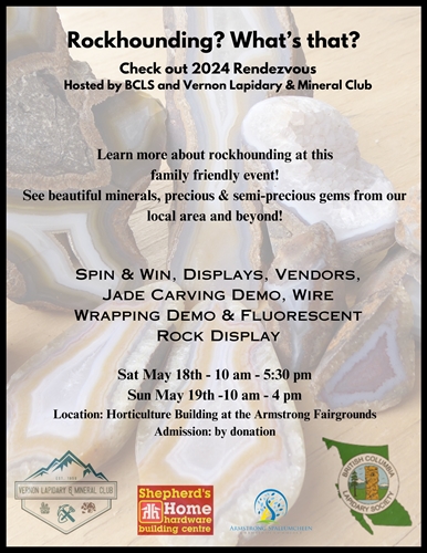<p>Learn more about rockhounding with the BCLS and Vernon Lapidary & Mineral Club! This is a 2 Day family friendly event with lots of demonstrations, displays, vendors, and spin to win! Admission by donation. <br />Saturday May 18th 10am-5:30pm <br />Sunday May 19th 10am-4pm <br />Sponsors: <br />Vernon Lapidary and Mineral Club <br />Shepherd’s Home Hardware <br />Armstrong Spallumcheen Chamber of Commerce <br />British Columbia Lapidary Society</p>