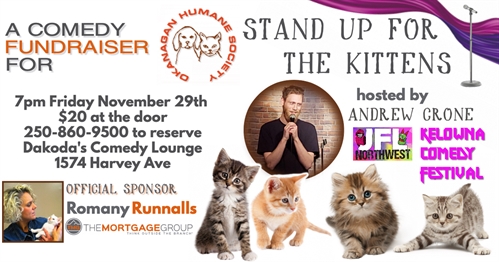 Romany Runnalls of the Mortgage Group is proud to present Stand Up for the Kittens for the Okanagan Humane Society. We will be donating 100% of ticket sales to this important cause. Come out for a big night of laughs featuring Kelowna’s top comics and hosted by Andrew Crone. Andrew is a touring headliner who has performed on Just For Laughs Northwest. This show will be a fun night with eight different comedians on the show. There is truly something for everyone.All proceeds from the show will go toward the vet bills for a family of 18 newborn kittens who need immediate attention. Thank you to our generous sponsor, Romany Runnalls!