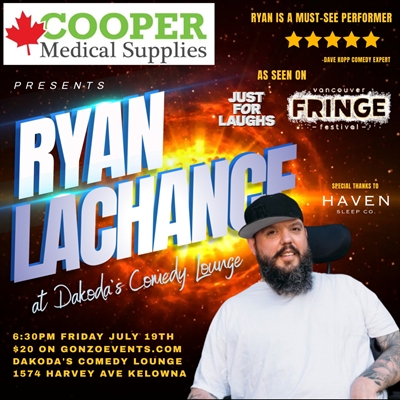 Join us for an unforgettable evening of laughter with the one and only Ryan Lachance at Dakoda’s Comedy Lounge on Friday, July 19th at 6:30 PM, proudly presented by Cooper Medical Supplies. Ryan Lachance, a professional stand-up comedian hailing from White Rock, British Columbia, brings over 25 years of stage experience to the mic, delivering a hilarious and uniquely personal performance you won’t want to miss.Ryan is a master storyteller who infuses his comedy with his unique perspective as a comic living with quad-spastic cerebral palsy. His intensely personal anecdotes about growing up in Alberta and BC, combined with the everyday joys and serious challenges he’s faced, are spun into a brilliantly entertaining, totally unique, and memorable show.A stalwart of the Vancouver Comedy Scene, Ryan has headlined local shows and toured extensively throughout western Canada. He was a feature performer at the Vancouver Fringe Festival in 2019, headlined at House of Comedy in April 2022, and is a regular act at Yuk Yuk’s, House of Comedy, and Just for Laughs. Ryan also recently contributed to the Just for Laughs Best of the West comedy album compilation, showcasing his standout talent.Don’t miss this chance to see Ryan Lachance live in Kelowna! Special thanks to our sponsor, Cooper Medical Supplies, for making this event possible. Grab your tickets now and get ready for an evening filled with laughter and unforgettable moments.