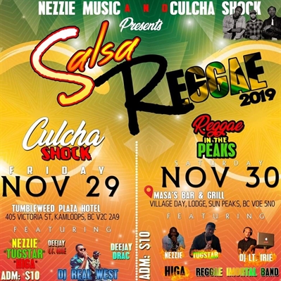 Kamloops Salsa Reggae weekend a weekend with a good mix of Latin and reggae music. Two parties two different locations;Nov 29 @ The Tumbleweed Lounge @ the Plaza Hotel Culcha Shock!!Door opens @9pmEntry $10Live performance byHigaNezzieTugstar Music by DJ WestDeejay Drac and more Nov 30 in Sunspeaks Masa Bar and GrillReggae in the Peaks Doors opens @ 9pmEntry $10Live performanceTugstarHiga Nezzie The immortals Band Music By LT Ireand more