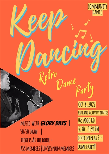 Open community dance with Glory Days music at the Rutland Activity CenterSaturday night dance at the Rutland Activity Center with Glory Days – a ‘great little’ dance band Get your dancing shoes on and come out for a night of dancing and fun. Dance or sing along to the songs you love to remember, performed by Glory Days. Country, latin, classic rock, waltz, polka, fox trot – they have the right beats to get you moving. Visit www.glorydayskelowna.com for band info. BYOB bring your own beverages (non alcoholic) and snacks or purchase a variety of beverages and snacks at the dance.A valid BC Vaccine Card is still required to enter the Rutland Activity Centre. Call 250-878-0356 for more info. Email kenfraser@shaw.ca