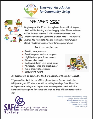 <p>WE NEED YOU!Beginning on the 1st and throughout the month of August, SACL will be holding a school supply drive. Please visit our office located in suite #301 (Administration) at the Andover building in Downtown Salmon Arm—371 Hudson Avenue NE to donate. We are looking for new/unused items. Please help support our future generations.Preferred supplies are: Pencils, pens, erasers Pencil crayons, markers, crayons Highlighters, pencil sharpeners Binders, duo tangs Backpacks, lunch kits, pencil cases Notebooks, lined and graph paper Tape, glue sticks, scissors Calculators, rulersAll supplies will be donated to the Safe Society at the end of August. If you can’t make it to our office, please join us for our fundraiser BBQ on August 16th where we will be selling hot dogs from 11am-2pm with proceeds being used to purchase more supplies. SACL will also have a collection point for those who wish to drop off any items on that day.</p>