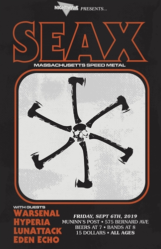 RR Booking and Nightwave Productions present an evening of fast, heavy and melodic metal featuring:Seax (Thrash / Speed Metal from Worcester, MA)Bandcamp: http://www.seax.bandcamp.comWarsenal (Speed Metal from Montreal, QC)Bandcamp: https://warsenal.bandcamp.comHyperia (Melodic Thrash Metal from Calgary, AB)Bandcamp: http://hyperiametal.Bandcamp.comLunAttack (Heavy \ Speed Metal from Calgary, AB)Facebook: https://www.facebook.com/LunAttaxx/EdenEcho (Melodic Metal from Kelowna, BC)https://www.edenechoband.com/Friday, September 6th, 2019Muninn’s Post575 Bernard AveDoors at 7Bands at 8$15 coverAll ages!!