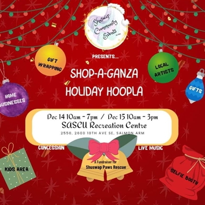 <p>Support local. Shop local. <br />Shuswap Community Events is excited to invite you to our 2nd Shop-a-Ganza Holiday Hoopla. Come out and find all of your favorite local vendors broglught together for your holiday shopping experience. Bring the kids to hang out in our kids area filled with games and a coloring contest sponsored by Healthy Spot. By dontation to the Shuswap Paws Rescue have your gifts wrapped while you enjoy a snack from the Girl Guides at our concession, or lunch from Van’s Grill. Before you head out, have some fun creating memories in our selfie corner. <br />We can’t wait to see you! <br />Entry is by donation to the Shuswap Paws Rescue Society.</p>