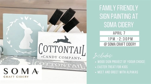 <p>Sign Painting at Soma CideryJoin us at Soma Craft Cidery in South East Kelowna for a creative afternoon. Soma Craft Cidery will be providing Easter treat for the kids and will be offering a meet and greet with the Alpacas.Rustic Chalk decor will be offering one hour sign painting where everyone will be able to create a small sign project. There will be many designs and colours to choose from. Kids and adults all ages are welcome to join.Time: 1-2pm Sign PaintingCost: $21 per person – adults and kids (kids 4 and under can complete 1 project together with a parent)TicketsTickets for Sign Painting at Soma Cidery can be booked here.</p>