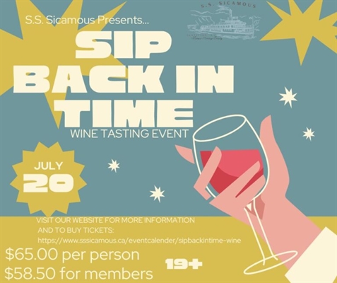 <p>Join us onboard the S.S. Sicamous for a full wine tasting experience. Guests will enjoy tastings from local wineries along with a charcuterie bar and live music, from 1 – 4PM.Sip Back in Time is our annual wine tasting event. Get in the spirit of bygone days and wear your best roaring twenties summer beach outfits while you sip on great local drinks, accompanied by savory bites from our friends at Brodo Kitchen. Swing along to the musical stylings of Yanti while you explore the S.S. Sicamous Museum and its many vignettes of life on the lake in the 1920’s and beyond! <br />Tickets include: full museum access, keep sake glass, charcuterie treats, multiple local tasting experiences, & live ukulele cover music. Plus the ability to participate in our silent auction, with proceeds going towards the restoration of the S.S. Naramata.</p>