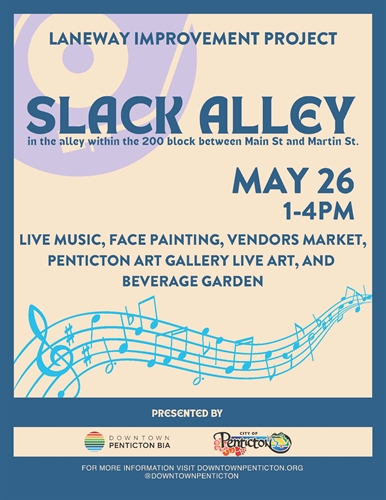 <p>Slack Alley, the eagerly awaited family-friendly event, is back with a bang this year! Mark your calendars for this exciting occasion filled with entertainment, delicious food, and endless fun. Join us in the laneway between 200 Main and Martin Street from 1:00 p.m. to 4:00 p.m. on May 26 as we kick off the season in style. <br />There’s something for everyone at Slack Alley, with a diverse range of activities and attractions for all ages. Attendees can enjoy live music from talented local musicians, live painting, engaging children’s activities, refreshing beverages, mouth-watering food options, and much more! <br />“We are ecstatic to bring Slack Alley back to our community as the kickoff to our event season,” said Brett Turner, Executive Director of the DPBIA. “The DPBIA is dedicated to infusing vibrancy into our downtown spaces.” <br />Don’t miss out! Mark May 26 on your calendar and bring your friends and family to experience Slack Alley. Follow us on social media for updates, featured artists, and more! <br />Thank you to our community and corporate sponsors, including the City of Penticton, The Hub on Martin, Penticton Art Gallery, and Amuzing Fun Rentals.</p>