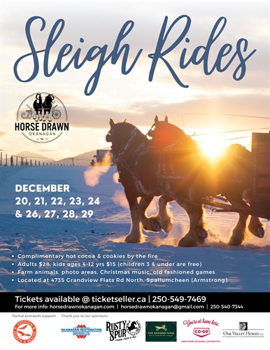 Tickets are available through Ticketseller in advance at https://www.ticketseller.ca/tickets/event/horse-drawn-okanagan-sleigh-ride-1… or by calling 250-549-7469. Sleigh rides run every half hour on the hour, on Dec 20, 21, 22, 23, 24, 26, 27, 28, 29, with afternoon and evening times available. The cost is $28 for adults, $15 for children 4-12 years, ages 3 and under free (no ticket is required and the child may be required to sit on the lap of a parent). Our event location is at 4735 Grandview Flats Rd North, Spallumcheen (Armstrong), BC.