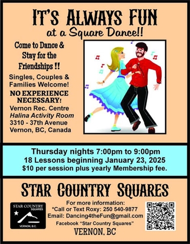 <p>Presenting upcoming sessions for absolute newcomers is the Star Country Squares dance club, the only square dance club currently operating in the Okanagan Valley. They’re celebrating their 25th Anniversary this year. The club was formed as an amalgamation of the Vernon Stardusters, which originated in the 1960’s, and the Sun Country Squares dance clubs. <br />The square dance fun starts at 7 pm Thursday January 23rd and newcomers are also welcome on subsequent Thursdays: January 30, February 6 & 13. The venue is the Halina Activity Centre at the back of the Vernon Recreation Complex, 3310 37th Ave. No pre-registration is required, just drop in for a modest fee of $10/night to discover the vibrant activity. Instructing as the Caller-Teacher will be the very friendly Allan Peterson of Salmon Arm. <br />The structure of the square dance is for paired-off teams of 8 people, standing in a square formation, to interact with each other as they hear various moves or “calls” from a Caller. They step to a steady beat of music wherein the rhythms range from pop to country and show tunes to golden oldies. <br />Furthermore, the square dance program called Social Square Dancing has been revitalized from its heritage roots into a condensed program of fewer calls taught in less time, therefore getting dancers moving and having fun sooner. <br />While some of the calls are choreographed to a particular piece of music, other routines are comprised of random calls where the dancer has to listen carefully to know which way to go. Those can be a source of spontaneous laughter because dancers often anticipate the direction only to find themselves going another way. <br />The Star Country dance club supports the North Okanagan community, including the annual Vernon Winter Carnival. Join in on Thursday February 13th at 7 pm for a special free Open House square dance in celebration of the Carnival. The “Hip to be Square” dance event will correspond with the Carnival’s 1980’s theme. Participants in the Carnival event who try square dancing and discover the fun will be welcome to return on the following Thursdays for weekly instruction. <br />Casual attire is advised and footwear should be low heel and soft-soled. Most ages are welcome at the lessons in Social Square Dancing including singles, couples and families. Youth must be aged 12 years or up and accompanied by an adult. As a special welcome to youth dancers, a half price fee will apply for those aged 12 to 19 years inclusive. <br />For adults, there’s a special offer in place regarding admission upon starting on January 23rd. Call or text the club for details about the program and the membership fee. <br />Social Square Dancing really is all about the fun. North Okanagan residents are warmly welcomed to come give it a try.</p>