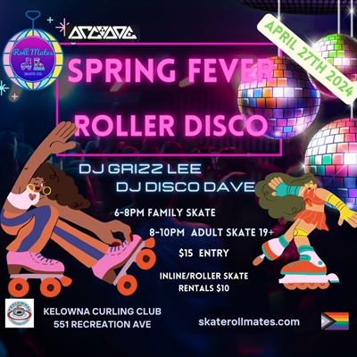 <p>Roll Mates Skate Co. and Arcade present Spring Fever: Roller Disco. An evening of roller skating featuring local move and grooveshakers DJs Grizz Lee and Disco Dave from Arcade.Bring your own inline/roller skates or rent some for $10. We have both inline and roller skates available from sizes J9 to adult 14 available on a first come first serve basis. Entrance is $15. This is an alcohol free event (the bar is not open) but there will be drinks and snacks available for purchase. Coat/bag check provided by Kelowna Speedskating Club min donation $2.The evening starts with a family skate from 6-8pm where there will be a mix of popular music from the 70s to present day. DJs Grizz Lee and Disco Dave will be doing sets from 8-10pm bringing that funk and groove to keep those wheels rolling and glowing! The Roll Mates Skate Shop will be open with items like light up wheels, bearings and protective gear to purchase.See you there!</p>