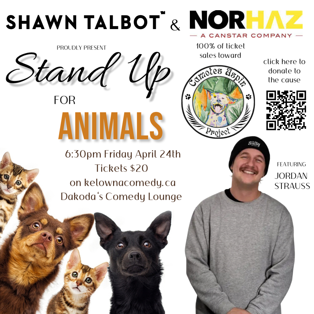 Join us for an evening of laughter with a purpose at Stand Up for Animals, a special comedy fundraiser supporting the Camotes Aspin Project.All ticket proceeds will go directly toward funding two large-scale spay and neuter clinics in the Camotes Islands, where access to veterinary care is currently nonexistent. By working alongside the local community and tourism sector, this initiative delivers essential animal care while promoting humane education—creating a meaningful and lasting impact.The night features some of Kelowna Comedy’s top performers, along with special guest headliner Jordan Strauss. Known for his sharp, offbeat, and effortlessly intelligent style, Jordan has shared the stage with Jon Dore and Shaun Majumder, performed at the Kelowna Comedy Festival, and earned top honours at Calgary’s Funny Fest. His debut album with Comedy Here Often has quickly become a fan favourite, and he’s sure to deliver a standout set.Special thanks to our generous sponsors, Shawn Talbot Photography and NorHaz, whose support helps turn this event into real, tangible change for animals in need.Enjoy a great night out while contributing to an important cause. Get your tickets now and be part of something that makes a difference.
