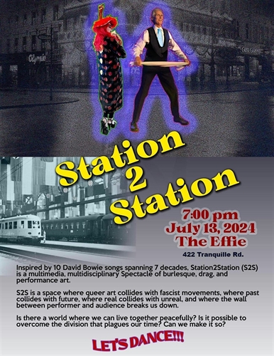 <p>Station2Station <br />Doors 6:30, Show 7pm, $15+fees in advance, $20 at the door, PG (Adult Themes) Minors allowed accompanied by an adult <br />About this Event <br />Inspired by 10 David Bowie songs spanning 7 decades, Station2Station (S2S) is a multimedia, multidisciplinary spectacle of burlesque, drag, and performance art. <br />S2S is a space where queer art collides with fascist movements, where past collides with future, where real collides with unreal, and where the wall between performer and audience breaks us down. <br />Is there a world where we can live together peacefully? Is it possible to overcome the division that plagues our time? Can we make it so? <br />LET’S DANCE!!! <br />Doors 6:30 <br />Show 7pm <br />$15+fees in advance <br />$20 at the door <br />PG (Adult Themes) <br />Minors allowed accompanied by an adult</p>