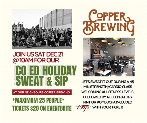 Join us Saturday December 21 for a fun co-ed holiday workouthosted by TWP fitness! $20 ticket includes the class and a glass of either beer or kombucha afterwards. A portion of the proceeds is donated to a local charity to help give back to the community this holiday season.