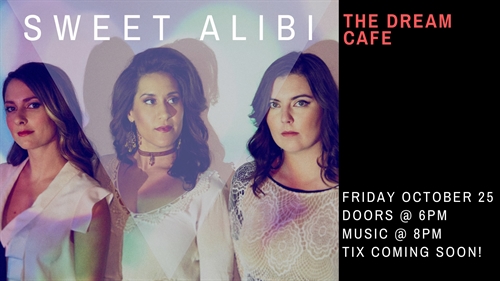 /// Sweet Alibi Live @ The Dream Cafe Penticton //WHERE| The Dream Cafe, 67 Colourful, Front St, Penticton BCWHEN| Friday, October 25, 2019DOORS| @ 6pmMUSIC| @ 8pmTIX| https://thedreamcafe.ca/upcoming-penticton-entertainment/#1560485165322-2780e2ca-f2eb ABOUT SWEET ALIBI|Known for their soulful three-part harmonies, Western Canadian Music Award Winners Sweet Alibi, have shared their folk roots-pop infused music with listeners across North America and Europe since 2009. Their music has garnered national accolades and awards, has been featured on MTV Canada, CMT, it has received major radio play on college/community and satellite radio, with several songs in the top 20 of CBC Radio 2’s national charts.“Sweet Alibi definitely belongs in the category of best Canadian folk-pop artists” – Coolibri GERMANYThe band is currently working on their fourth studio album with producers Matt Peters and Matt Schellenberg of Royal Canoe (Begonia). The album is set to be a melodic experience focused on hooky guitar lines and layered beats, inspired by the likes of Alabama Shakes and Bahamas. Sweet Alibi’s sound has been evolving and refining through their past album releases, extensive Canada wide and international touring, as well as a focused effort to draw on the creative efforts of their favourite influencers. Not yet titled, their next album is slated for release early 2020.LISTEN| www.youtube.com/watch?v=b-lKpzESdy4