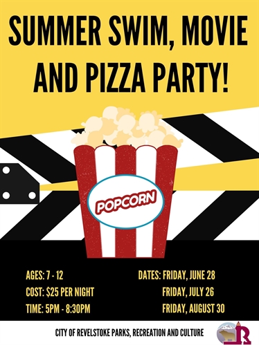 We are bringing back our swim and movie night for the summer months, but this time with PIZZA! Plan a night out for yourselves and drop the kids (Ages 7 – 12) with us.This fun packed evening is great for young friends to come and hang out. We will be hosting a swim in the Aquatic Centre followed by pizza and movie. Event is 5:00 pm to 8:30pm, swim 5:00pm to 6:30 pm, set-up and pizza 7:00pm to 7:30pm, movie 7:30pm to 8:30pm. Pick up 8:30 pm SHARP.$25per child includes admission to the Aquatic Centre, pizza and 3.5 hours supervision!