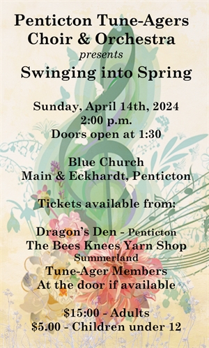 The Penticton Tune-Agers Choir & Orchestra invite you to their upcoming concert, “Swinging into Spring”. Melodies ranging from the music of Henry Mancini to Cohen’s “Hallelujah” will have you swinging to the sound; and you may just discover yourself a brand-new favourite. This concert is on a Sunday afternoon- 2 pm April 14th, at the blue church on the corner of Main and Eckhardt. Tickets can be purchased in advance from Dragon’s Den in Penticton, from the Bee’s Knees Yarn Shop in Summerland, or from members of the Tune-Agers. There will also be tickets at the door, which will be open at 1:30pm.