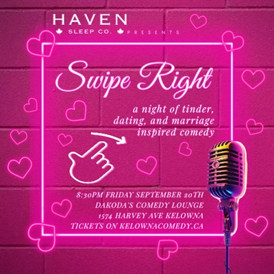 Get ready for a hilarious night at Dakoda’s Comedy Lounge on Friday, September 20th, at 8:30 PM with Kelowna Comedy’s latest show, “Swipe Right!” Sponsored by Haven Sleep Co., this event dives headfirst into the chaotic world of modern dating, where Tinder reigns supreme in a whirlwind of romance and absurdity. Prepare to laugh until it hurts as Kelowna’s funniest comedians share outrageous stories of epic dating disasters and unbelievable relationship sagas.Whether you’re blissfully coupled up or still navigating the dating scene, this show is your perfect match! Featuring a stellar lineup of Kelowna’s comedy all-stars, “Swipe Right!” guarantees an evening filled with non-stop laughter and unexpected twists. Who knows? Amidst the comedic mayhem, you might just swipe right on a new connection! A huge thanks to Haven Sleep Co. for making this unforgettable night possible.