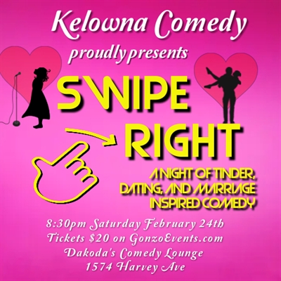 Get ready to laugh your socks off at Dakoda’s Comedy Lounge on Saturday February 24th, with Kelowna Comedy! We’re diving into the funny side of modern dating, especially the wild world of Tinder. It’s the ultimate game-changer when it comes to love, and we’ve got hilarious stories about dating disasters and relationships gone totally bonkers. Our city’s funniest comedians are all set to entertain you with their side-splitting tales.Whether you’re happily in a relationship or still figuring out the dating scene, this show is made just for you! We’ve got a fantastic lineup of Kelowna’s comedy superstars on this one and, who knows, you might just fall in love!Don’t miss out on this epic night of romantic comedy chaos! Swipe right on laughter and join us for a night of unforgettable fun!