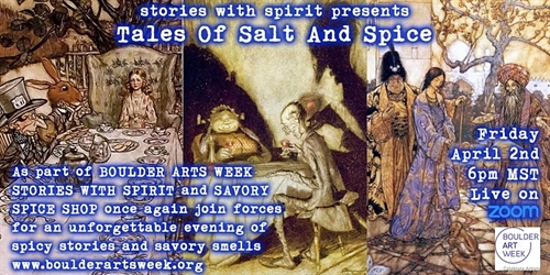 <p>For the seventh time, as part of Boulder Arts Week Stories with Spirit and Savory Spice Shop of Boulder once again join forces for an unforgettable evening of spicy stories and savory smells.While we were unable to preform this show last year, this year we are in the digital realm!Rachel Ann Harding and Cooper Braun will perform stories from around the world about salt, spices, chocolate, and food. Dan Hayward of Savory Spice will tell us all a little about the history of spices.Savory Spice Shop is a downtown Boulder institution selling an incredible variety of fresh ground spices. Savory is 100% Wind powered and proudly sells spices to local restaurants, breweries, food trucks, chocolatiers, and coffee shops.If you are local to Boulder, and attend the event, you will receive 10% off anything purchased from Savory for the week after the event!This is an All Ages show.When you get your ticket (you only need one, regardless of how many people are behind your computer) you will receive a confirmation email with the ZOOM link to the show.The show will take place at 6:00pm MDT (Denver) or 5:00pm PDT (Los Angeles), 7:00pm CDT (Chicago), 8:00pm EDT (New York)This show is a Pay What It’s Worth event based on your experience of the show. When the show is done we ask that you pay what you felt the hour of art was worth. If you feel the need to pay before the show, there will be links to do so in your confirmation email.</p>