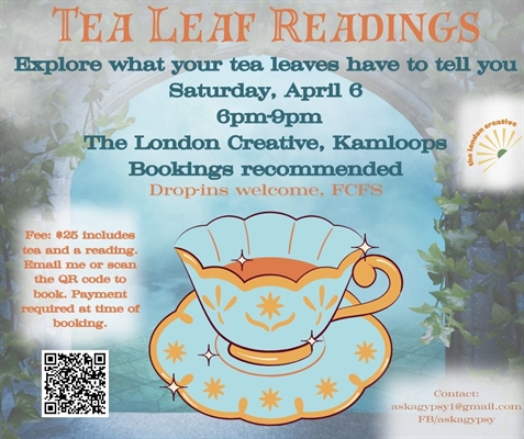 <p>Tea Leaf Reading at The London Creative <br /> Join me April 6, 2024 from 6pm-9pm at The London Creative in Kamloops! <br /> Bookings are recommended (you can book directly here: <br /> https://calendly.com/askagypsy/tea-leaf-reading-the-london-creative <br /> Drop-ins are welcome and will be assigned on a first come, first served basis, there is a limited capacity of 30. <br /> $25 for a tea of your choice and a reading. Estimated to take about 25 minutes (15 minutes to enjoy your tea and snack and 5-10 minutes for the reading). <br /> If you have any questions, please contact me! Looking forward to seeing you there!</p>