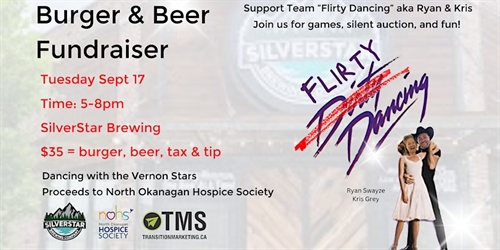 <p>Team Flirty Dancing – aka Ryan Sheepwash and Kris Fuller – are excited to announce two upcoming fundraising events in support of the North Okanagan Hospice Society (NOHS). Join us for a fantastic time while contributing to a great cause! <br />Burger, Beer & Silent Auction Night <br />• Date: Tuesday, September 17, 2024 <br />• Time: 6:00 PM <br />• Location: SilverStar Brewing, Vernon, BC <br />• Details: For just $35, enjoy a delicious burger and a refreshing beer, with tax and tip included. The evening will also feature a silent auction with exciting items up for grabs. Come for the food, stay for the fun, and support Team Flirty Dancing!</p>