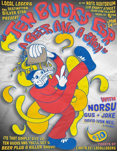 <p>Bring ten bucks and you’ll get a beer and a killer show from some of Vernon’s top talent brought to you by Local Loser’s. <br /> We are excited to return to SilverStar village, this time bringing some of Local Loser’s bets friends! Get ready to have a great evening, fueled by astonishing musical talent, tear jerking performances, and a free beer or cider! <br /> Line up: <br /> David Ivan Niel & Friends! 6:30pm – 7:00pm. <br /> Gus + Jake! 7:00pm – 7:30pm. <br /> NORSU! 7:30pm – 8:30pm. <br /> WHEN: Sunday, 14th January. 6:00pm – 9:00pm. <br /> WHERE: NATC Auditorium, SilverStar Village. <br /> PRICE: $10.00 entry per person.</p>