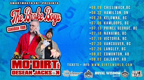 <p>Smartmouth Ent & Skwrl Entertainment Present: <br />The Broke Boys Tour Has Arrived!! <br />MO’DIRT & DESEAN JACKSON LIVE IN KAMLOOPS!! <br />Tour Support: Morbidrip <br />Local Openers: <br />Slum Glutton, Natty Snaps, 6 Cell, C-Quick <br />PRESALE: $15 <br />Door price: $20</p>
