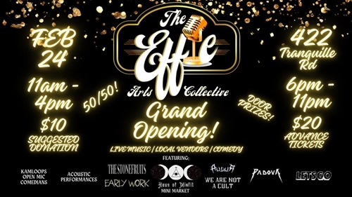 <p>The stonefruits and the effie are proud to present the Grand Opening of the effie. With a day full of local vendors, music and comedy! <br /> Vendors and acoustic music from 11-4 with suggested donation of 10$(pwyc) <br /> Music and comedy from 6-11 20$ <br /> Featuring <br /> The Stonefruits <br /> Early Work <br /> Let’s Go <br /> We are not a cult <br /> Augur <br /> Padova <br /> With Kamloops open mic comedians in between. <br /> Door prizes, 50/50 and everything in between you don’t wanna miss this! <br /> TICKETS <br /> https://www.eventbrite.ca/ <br /> All proceeds will be donated to the effie so we can continue to have a space to create and perform.</p>